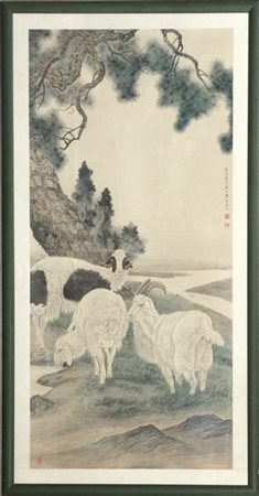 Dipinto ad inchiostro e colore raffigurante tre capre con calligrafia (cm 166x77) in cornice
