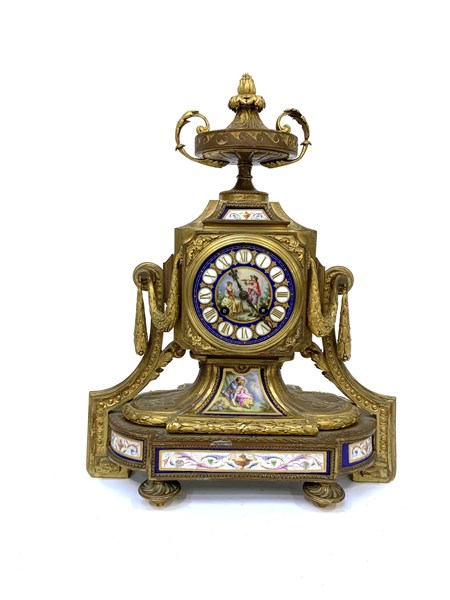 Pendola da tavolo in bronzo dorato decorata in rilievo a festoni e motivi vegetali, placche in porcellana e coppa biansata con coperchio nella parte superiore, quadrante in porcellana a numeri romani raffigurante una scena galante. Seconda metà XIX (cm 39x50) (difetti e mancanze)