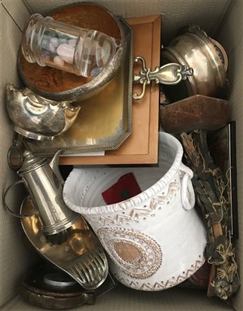 Cartone contenente numerosi oggetti di diverse epoche e fatture (difetti)