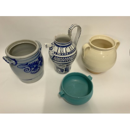 Lotto composto da una brocca, due vasi e una ciotola biansate in ceramica e terracotta di manifatture e decori diversi (difetti)
