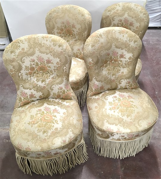 Gruppo di quattro poltroncine da camera con gambe anteriori tornite rivestite in tessuto a motivi floreali. Fine sec XIX (difetti)