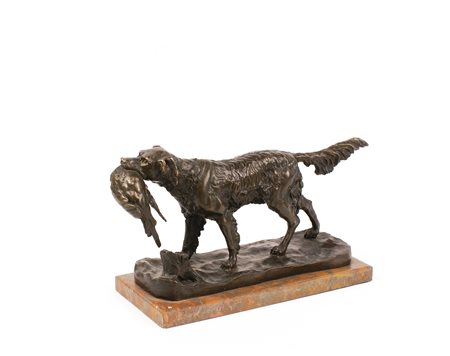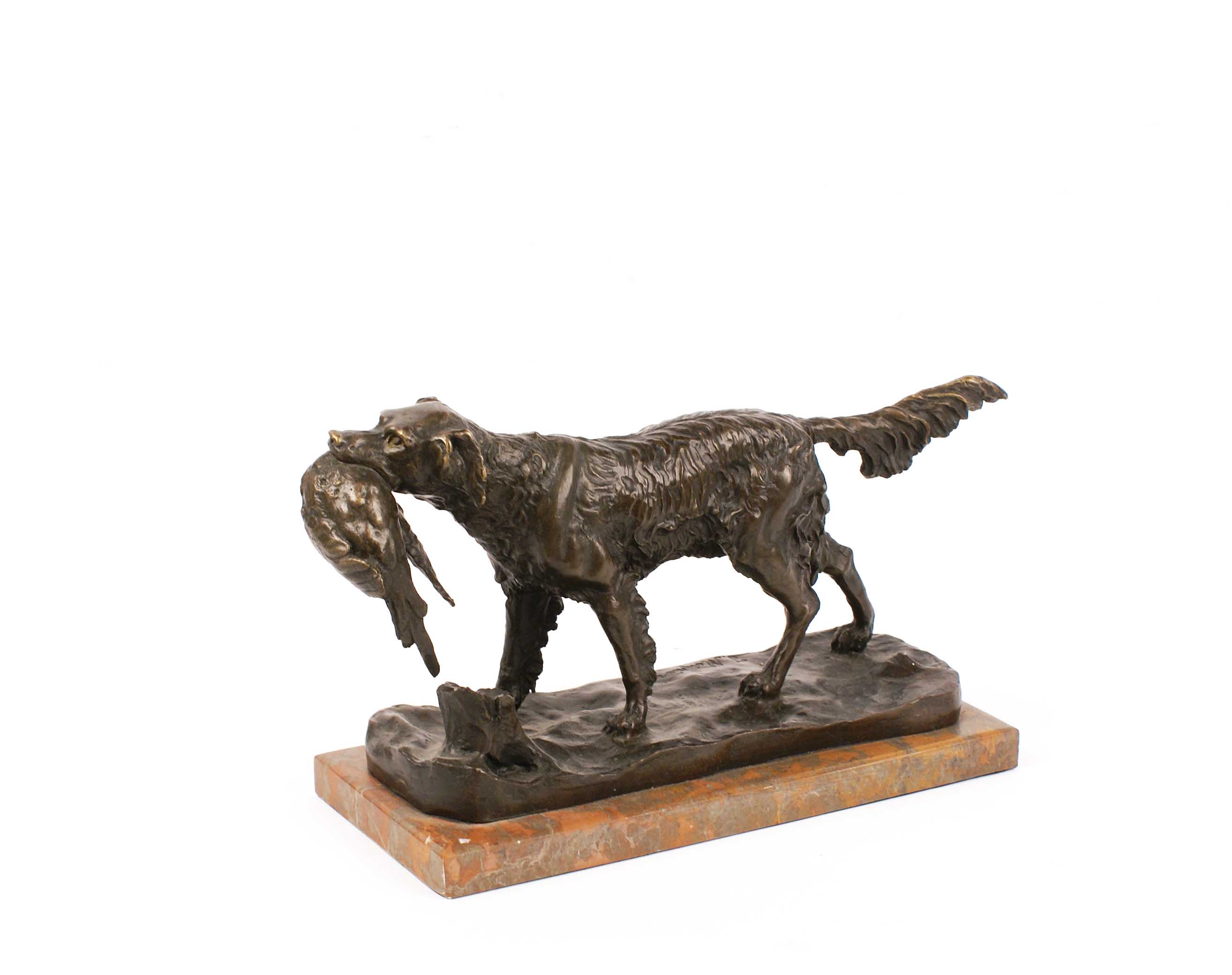 GRUPPO IN BRONZO Raffigurante un cane da caccia con la preda, poggiante su base rettangolare in marmo Dim. 17x30x11 cm.