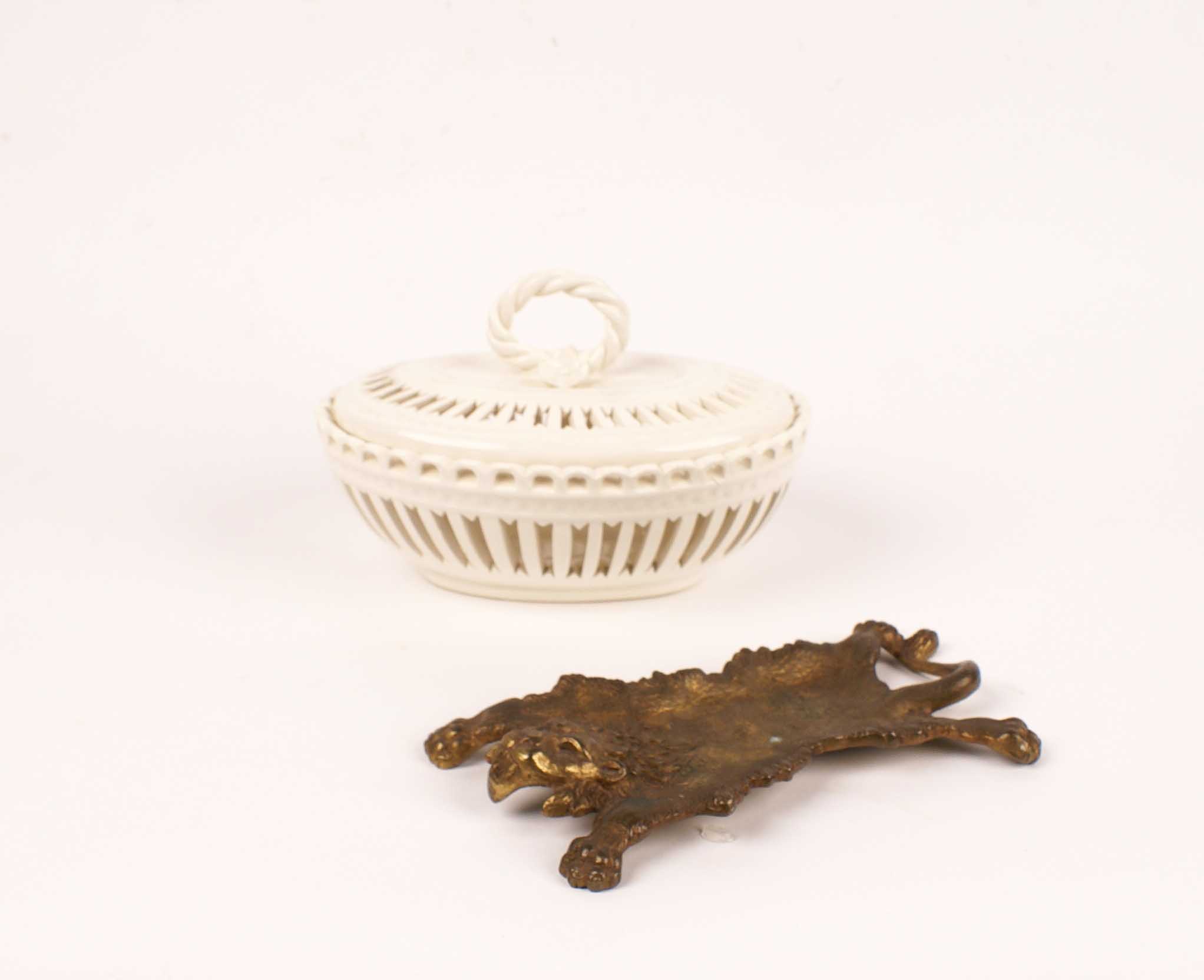 LOTTO DI DUE OGGETTI Composto da un cestino in porcellana e un oggetto in bronzo, misure diverse