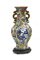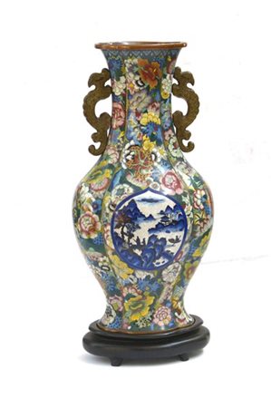 Vaso lobato con doppie anse a guisa di fenice stilizzata in metallo cloisonnè con decoro mille fiori e pannello con scena di paesaggio (h. cm 50) (lievi difetti)
