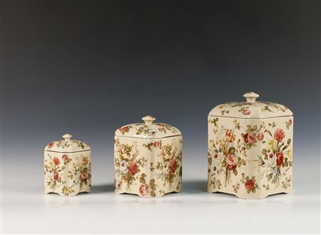 SET DI TRE SCATOLE CON RELATIVI COPERCHI Inghilterra In porcellana dipinta in policromia, misure diverse