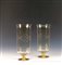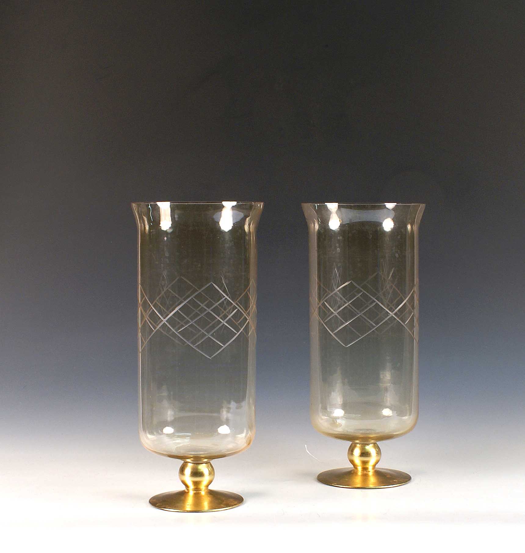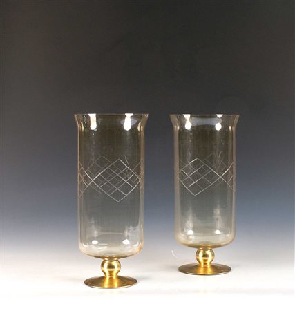 COPPIA DI VASI PORTACANDELE In vetro fumè molato e parzialmente dorato H. 36 cm.