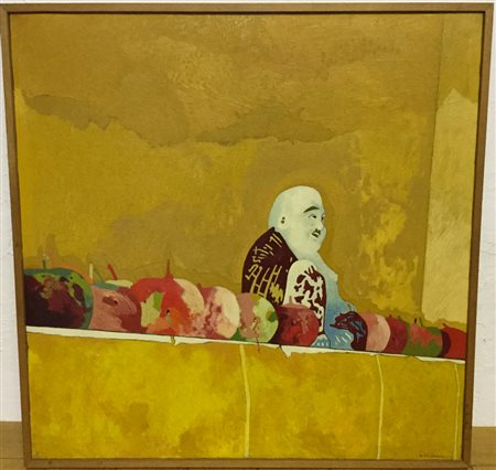 firmato e datato in basso a destra; firmata, datata e titolata al retro. Etichette al retro della Galleria d'Arte Bergamo e Galleria d'Arte la Nuova Pesa, Roma. In cornice (difetti)