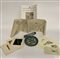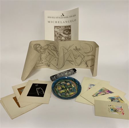 Cartone contenente nove piccole acqueforti di Roberto Crippa non firmate, una piccola ceramica - prova d'artista di Emilio Scanavino (h cm 24), un piattino (diam. cm 21) di artista indecifrato e datato 1954, un disegno di Guidotti, quattro piccoli acquerelli firmati Renato Missaglia e una brossura sui disegni di Michelangelo