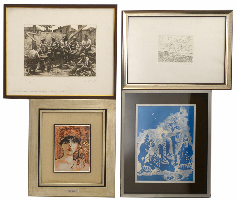 Lotto composto da un'acquaforte di Giovanni Omiccioli, due multipli su lastra d'argento di Gentilini e Cesarino Monti e un'acquaforte di firma indecifrata. Soggetti e misure diverse