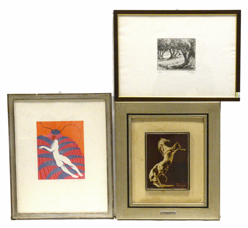Lotto composto da un multiplo su lastra d'argento di Costanzo Mongini, una litografia a colori di Pietro Diana e un acquaforte di Philippone, misure e soggetti diversi