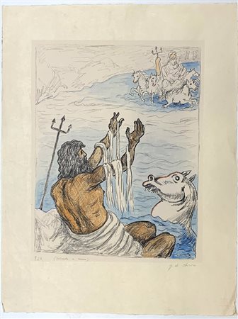 Giorgio de Chirico "Nettuno" 1973 litografia colorata a mano su carta applicata