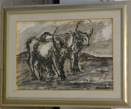 Romano Battaglia "Buoi" acquerello su carta (cm 50x70) Firmato in basso a destr
