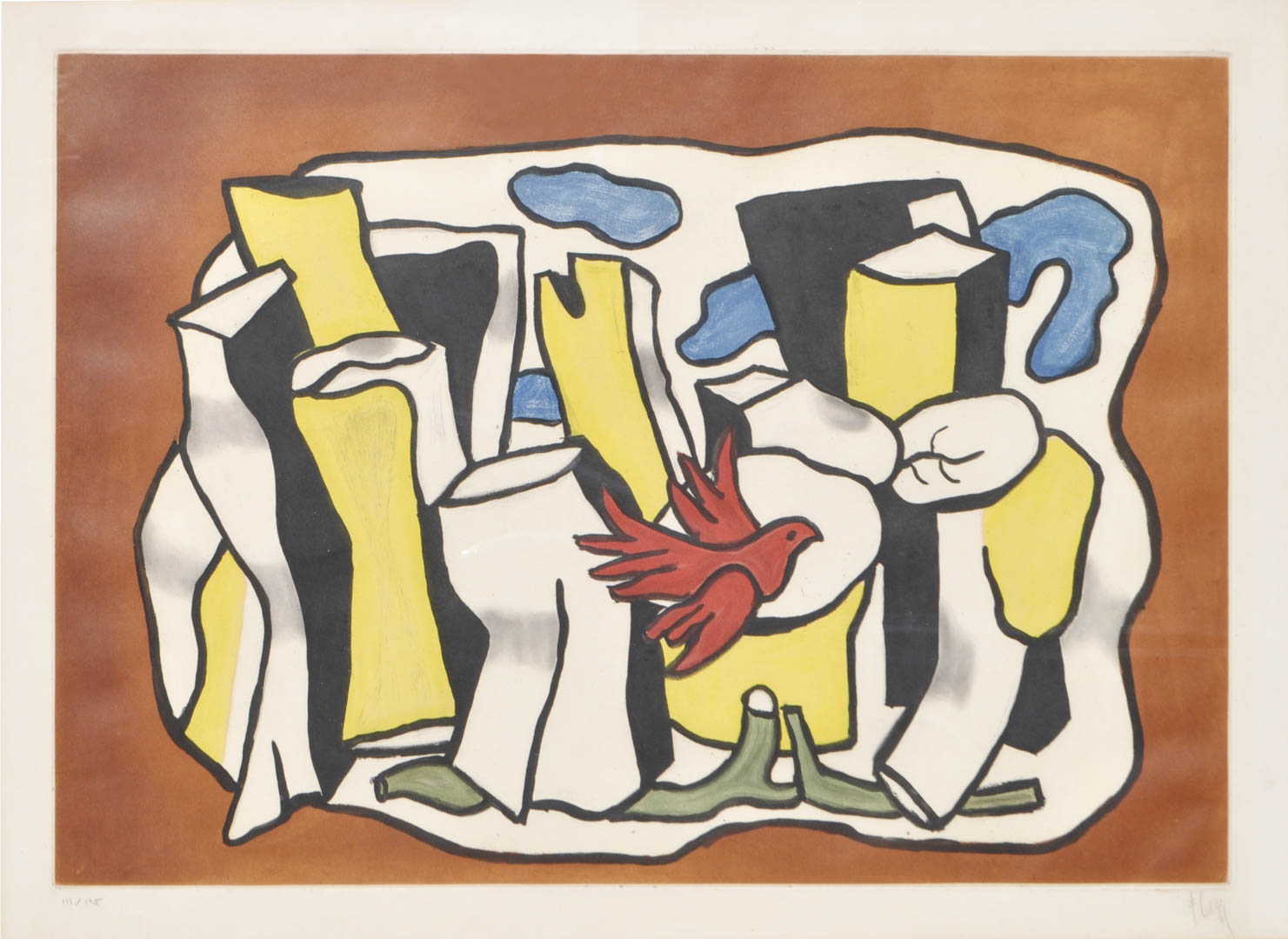 Ferdinand Leger (Argentan 1881 – Gif-Sur-Yvette 1955) L’oiseau rouge dans le bois, 1953;Acquatinta a col., 45 x 64 cm, edizioni M. Lacourière Paris