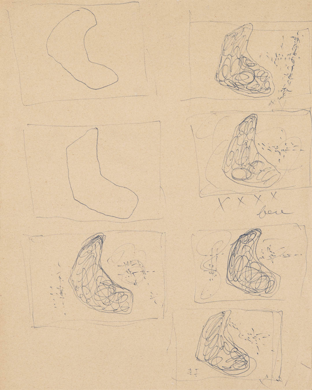 Lucio Fontana (Rosario 1899 – Comabbio 1968) Studi per concetto spaziale, 1957;Penna sfera blu su carta, 32,5 x 25 cm