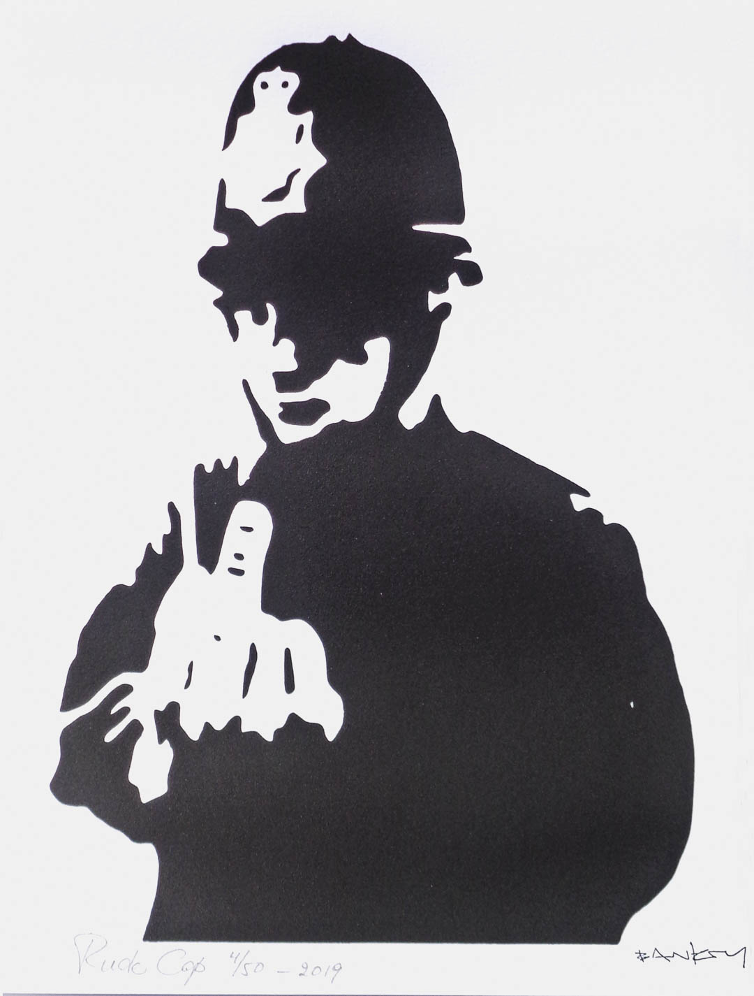 Banksy (1974) “Rude Cop, 2019;Stencil/Spray, 40 x 30 cm, Edizioni C-and-S