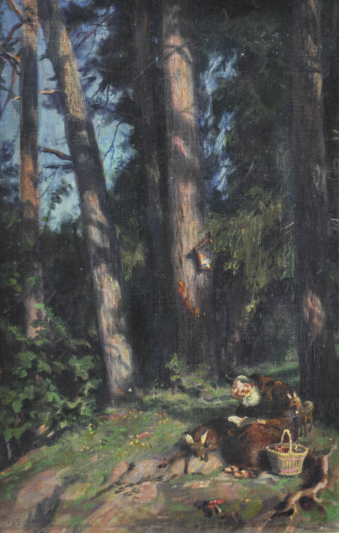 Thomas Riss (Haslach, Stams 1871 – Innsbruck 1959) Eremitaggio nel bosco;Olio su tela su cartone, 54 x 34 cm, in cornice