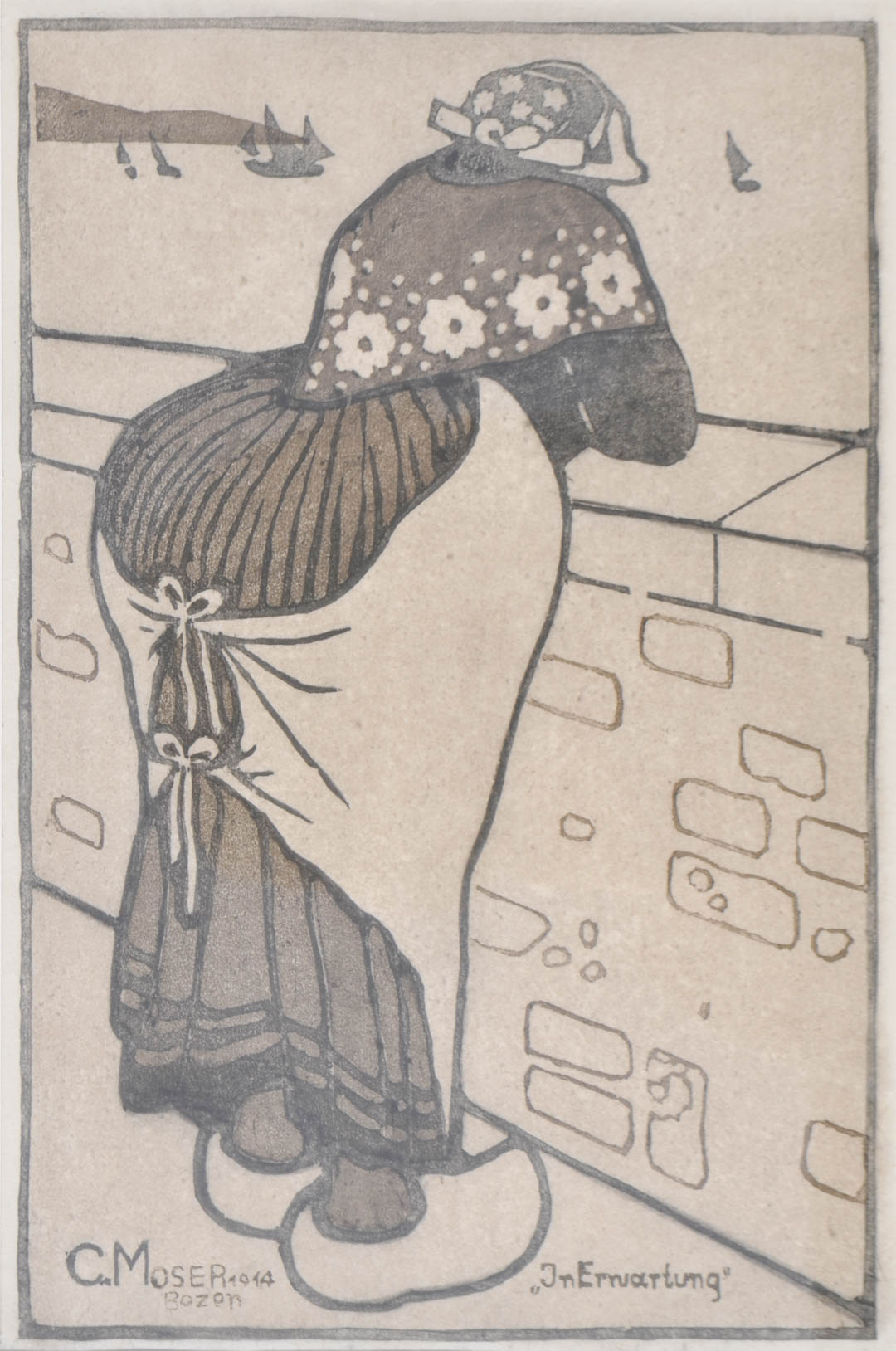 Carl Moser (Bozen/Bolzano 1873 – 1939) In attesa, 1914;Xilografia a colori, 33,4 x 21,7 cm, in cornice