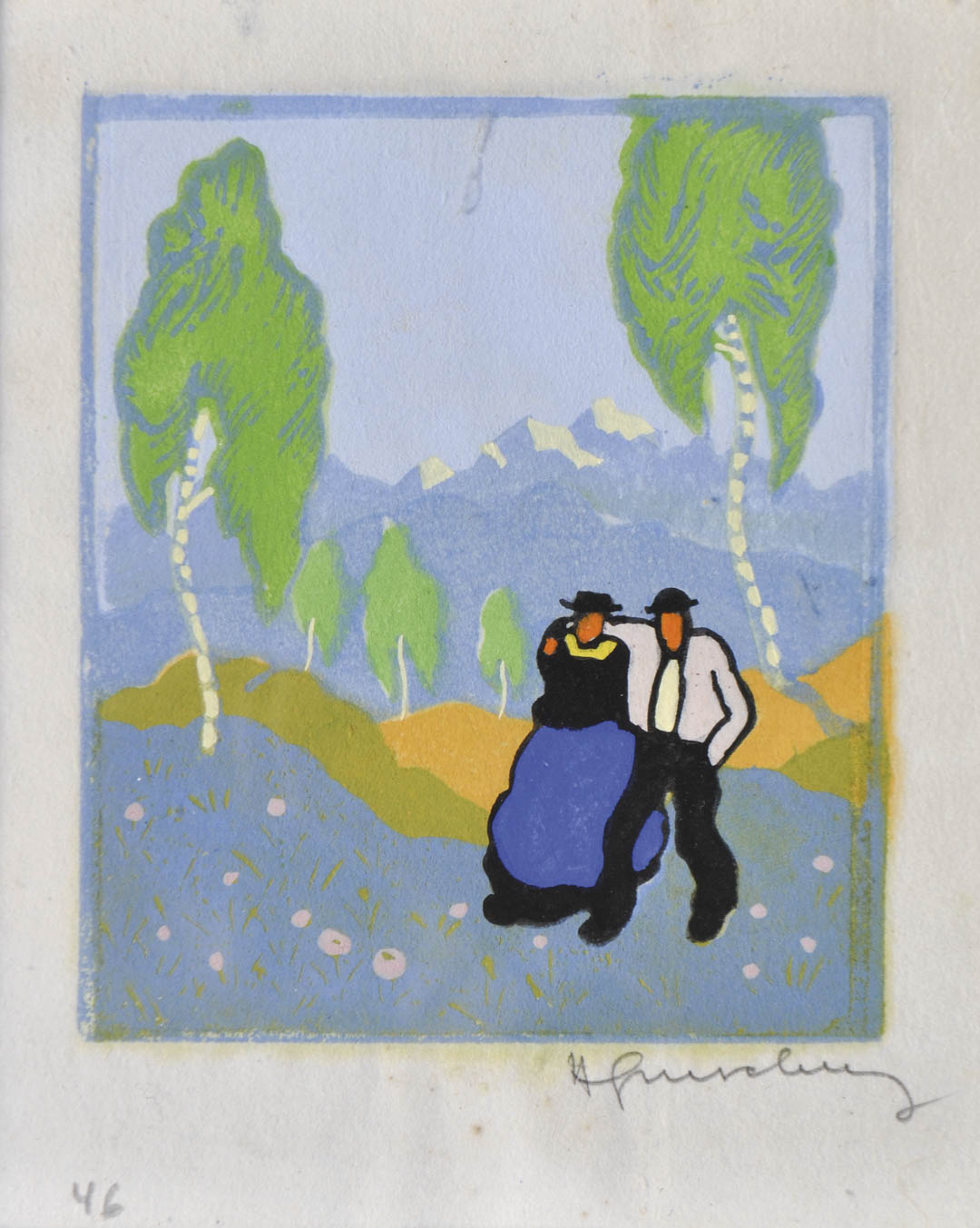 Herbert Gurschner (Innsbruck 1901 – London/Londra 1975) Coppia tirolese in primavera;Incisione su linoleum colorata, 16,5 x 14 cm (foglio), in cornice