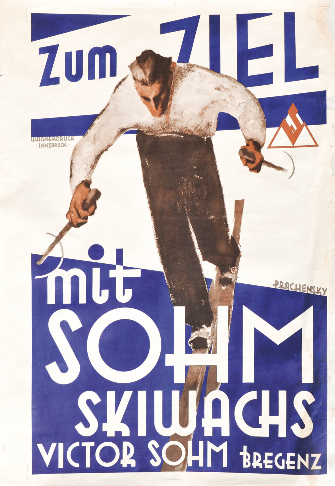 Wilhelm Nicolaus Prachensky (Innsbruck 1898 – Innsbruck 1956) Manifesto “Zum Ziel mit Sohm Skiwachs Bregenz“, 1935 ca.;Litografia, 97 x 62 cm (entro il passepartout), strappi laterali