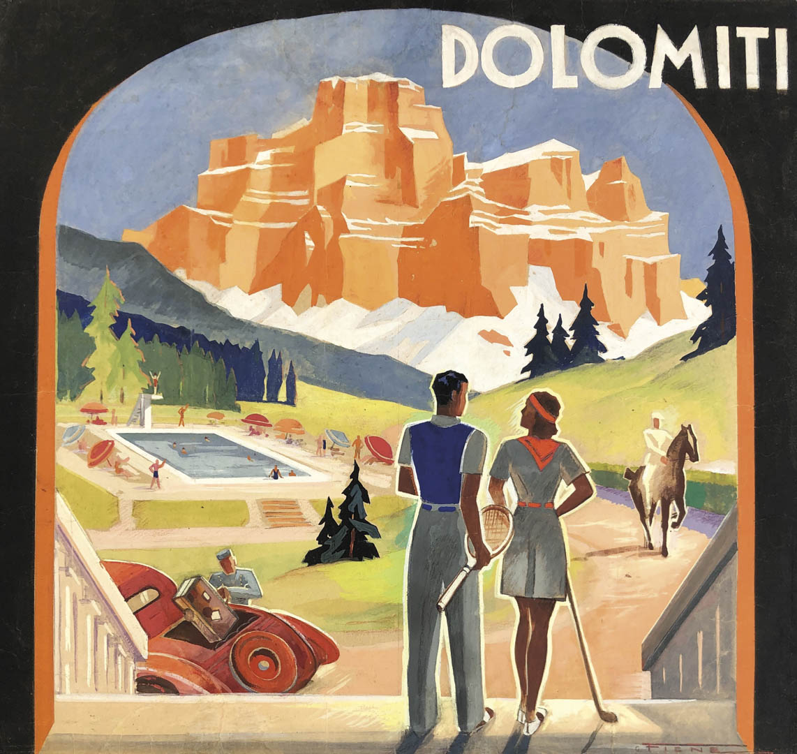 Josef Fiene Bozzetto manifesto “Dolomiti“, 1935 ca.;Tempera su carta, 43 x 45 cm, in cornice