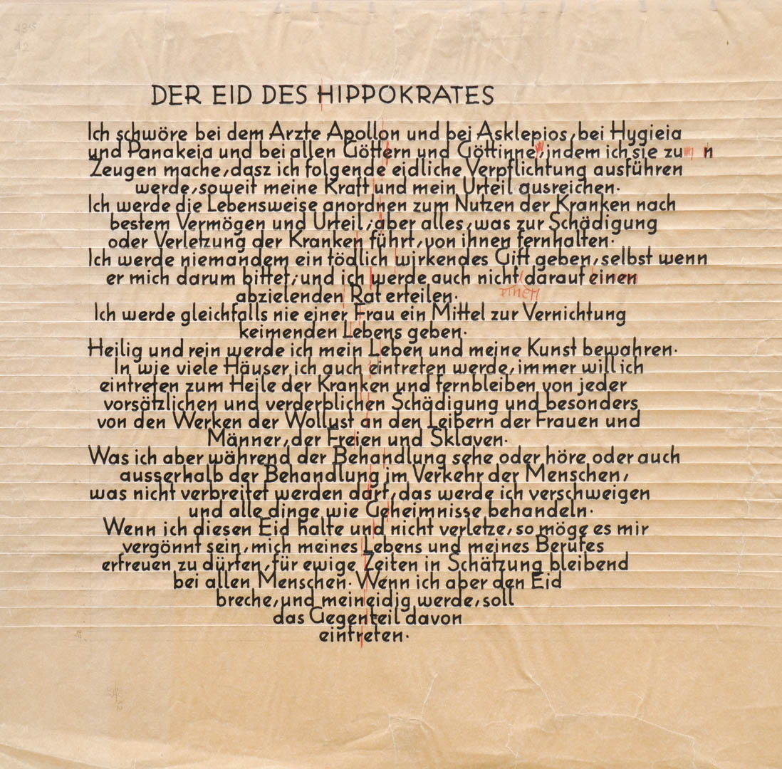 Anton Hofer (Bozen/Bolzano 1888 –1979) Scritta “Eid des Hippokrates“;China su carta trasparente, 43,5 x 45 cm