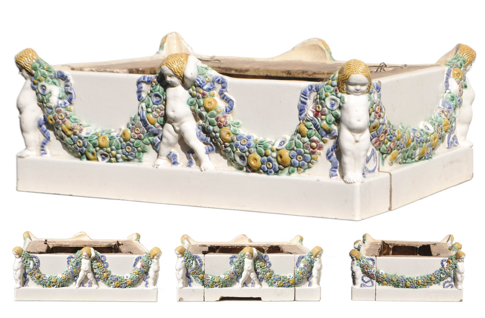 Michael Powolny (Judenburg, Steiermark/Stiria 1871 – Wien/Vienna Alzata per stufa con putti e ghirlande;Glasierte Keramik, 4 Teile, Gesamtmaße 60 x 50 x 23 cm, an