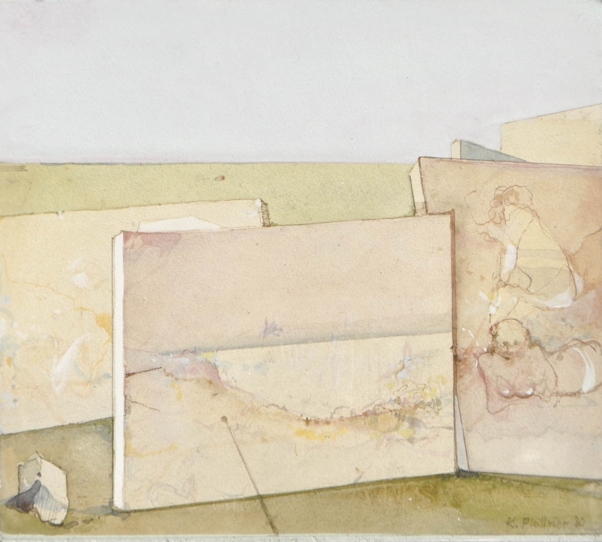Karl Plattner (Mals/Malles 1919 – Mailand/Milano 1986) Nell’atelier, 1980;Acquerello su carta su lastra, 20 x 22,5 cm, in cornice