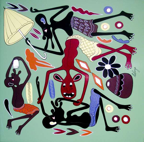 George Lilanga Msinitani mini, 1999 olio su masonite, cm. 61x61 Firma in basso al centro Certificato di autenticità a cura della Capt. Felix Lorenz,Lauenburg (Elbe) Germania