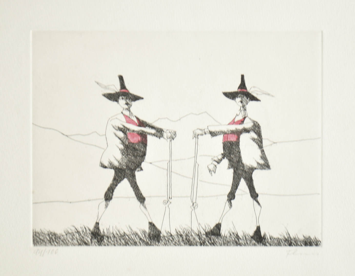 Paul Flora (Glurns/Glorenza 1922 – Innsbruck 2009) Due bersaglieri tirolesi;Acquaforte colorata, 14,6 x 19,7 cm (lastra)