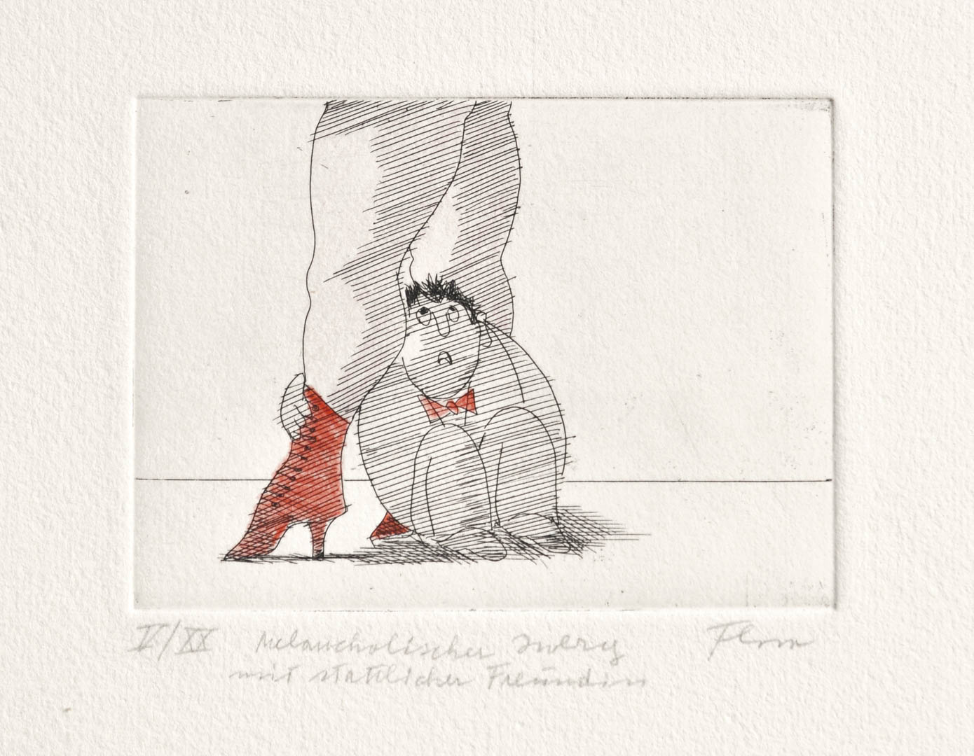 Paul Flora (Glurns/Glorenza 1922 – Innsbruck 2009) Nano melanconico con amica prestante;Acquaforte colorata, 8 x 11,5 cm