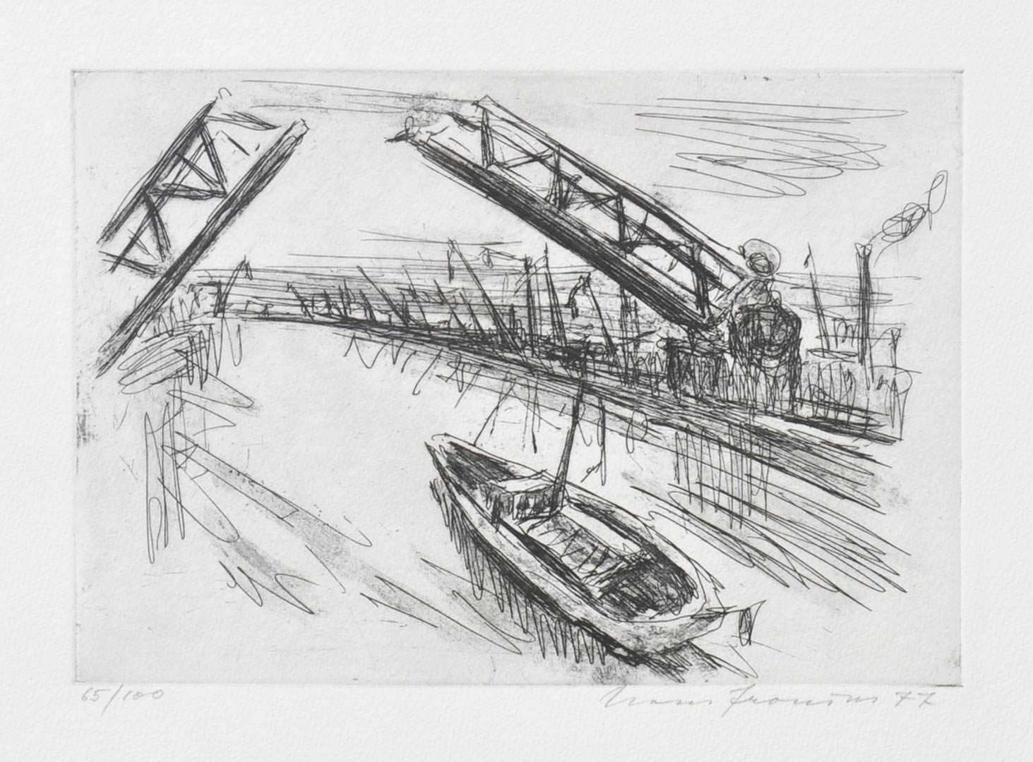 Hans Fronius (Sarajevo 1903 – Mödling 1988) Porto di Amsterdam, 1977;Acquaforte, 17,5 x 25,2 cm (lastra), in cornice