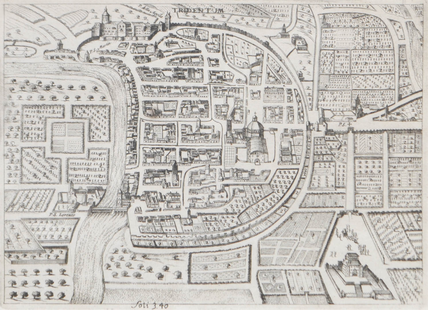 Matthäus Merian Tridentum/Trento, 1650 ca.;Incisione su rame, 17,5 x 24,5 cm (lastra)in cornice