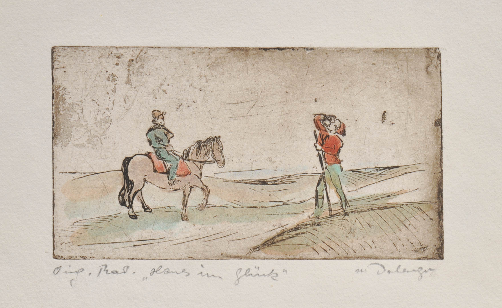 Maria Delago (Abtei/Val Badia 1923 – 2014) Hans im Glück, Bremer Stadtmusikanten...;3 acqueforti colorate, misure diverse