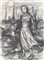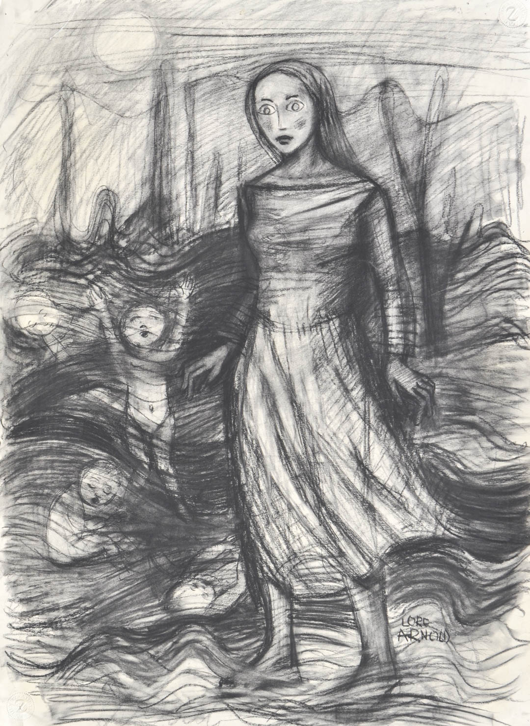 Lore Mauer-Arnold (Innsbruck 1923 – 1960) Donna con bambini minacciati;Gessetti neri, 60 x 44 cm