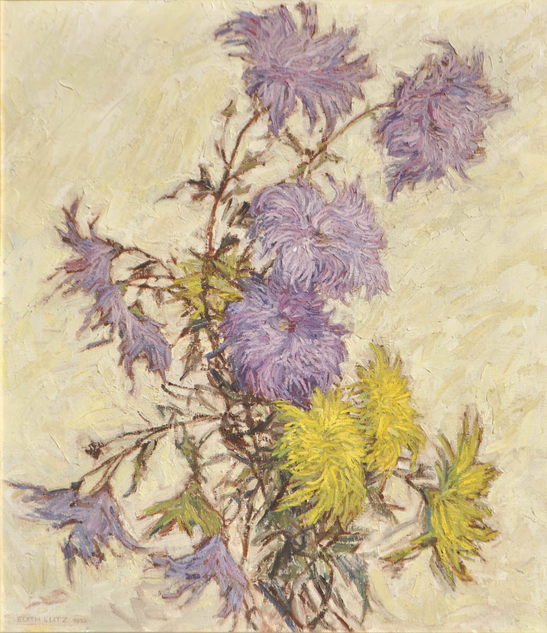 Edith Lutz-Romani (Kufstein 1894 – Tramin/Termeno 1983) Astri gialli e lilla, 1950;Olio su tela, 80,5 x 70,5 cm, in cornice