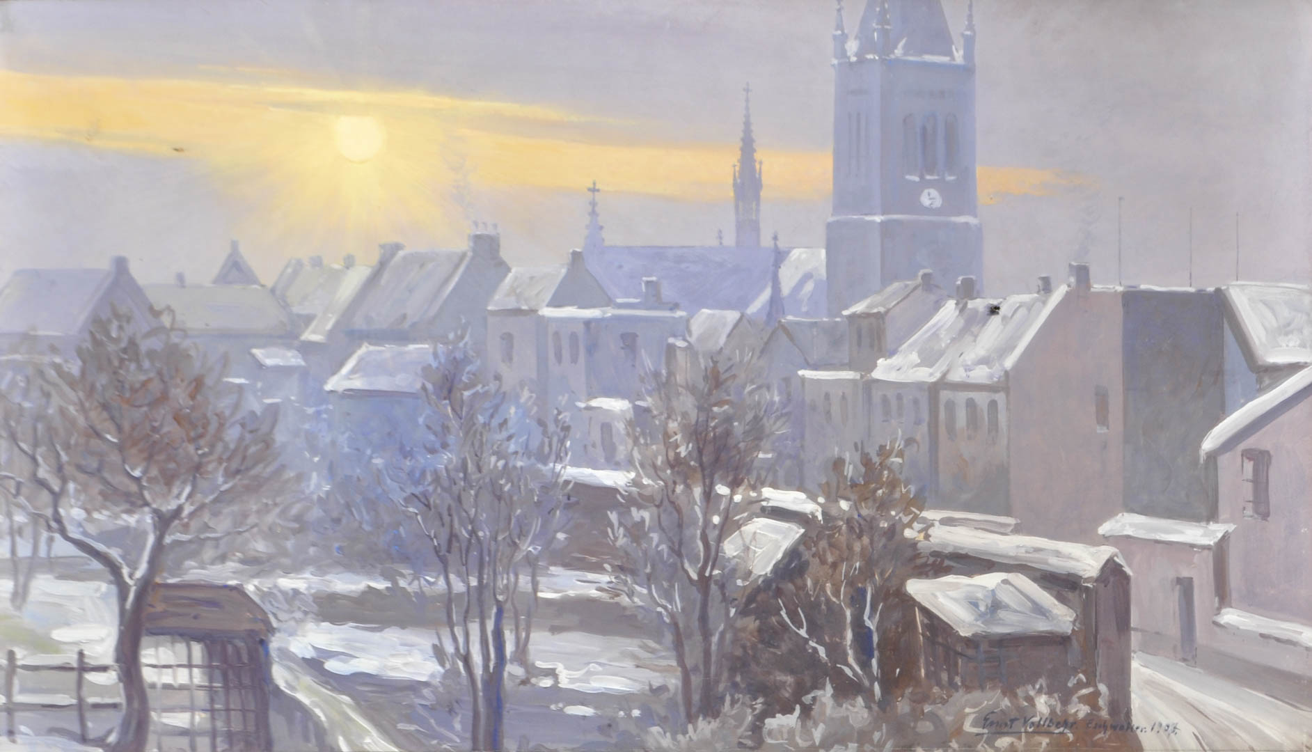 Ernst Vollbehr (Kiel 1876 – Krumpendorf am Wörthersee 1960) Eschweiler im Winter, 1907;Tempera su cartone, 56 x 97,5 cm, in cornice