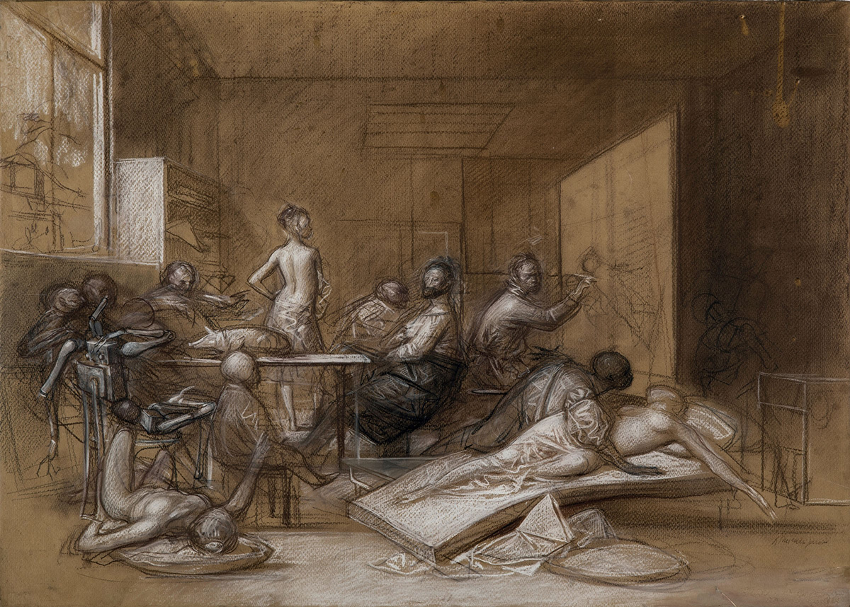 Riccardo Tommasi Ferroni (1934-2000), Scuola Accademica di pittura, matita e biacca su cartoncino intelato, cm 50x70 firmato in basso a destra, Provenienza: Galleria Il Gabbiano, Roma