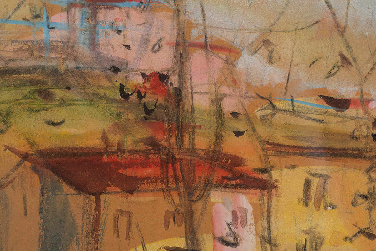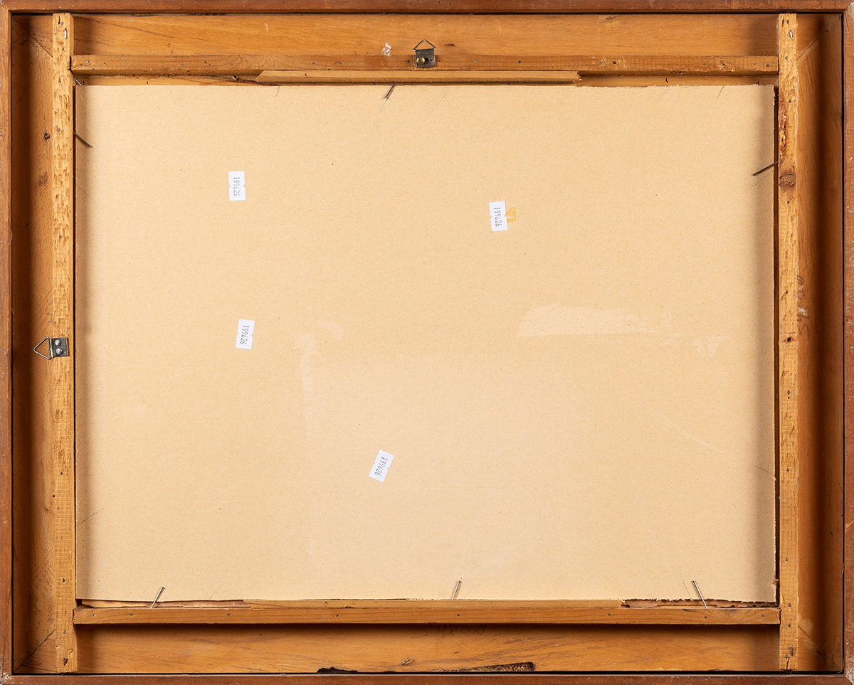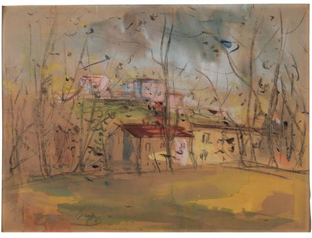 Luigi Spazzapan (1889-1958), Case tra gli alberi, 1942, tecnica mista su carta riportata su cartone, cm 37x50,5 firmato in basso a sinistra, Bibliografia: Spazzapan. Catalogo generale a cura di Sandro Alberti e Angelo Dragone, Vallecchi, Firenze, 1981, p. 249, n. 1037-1041