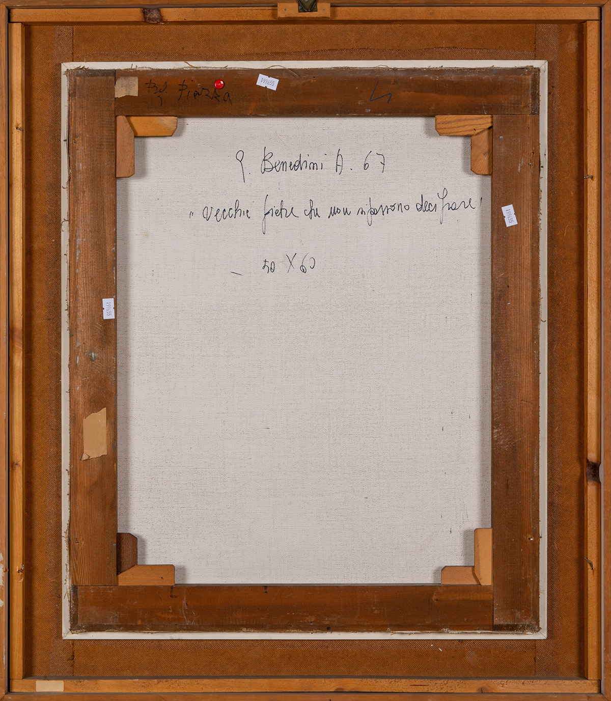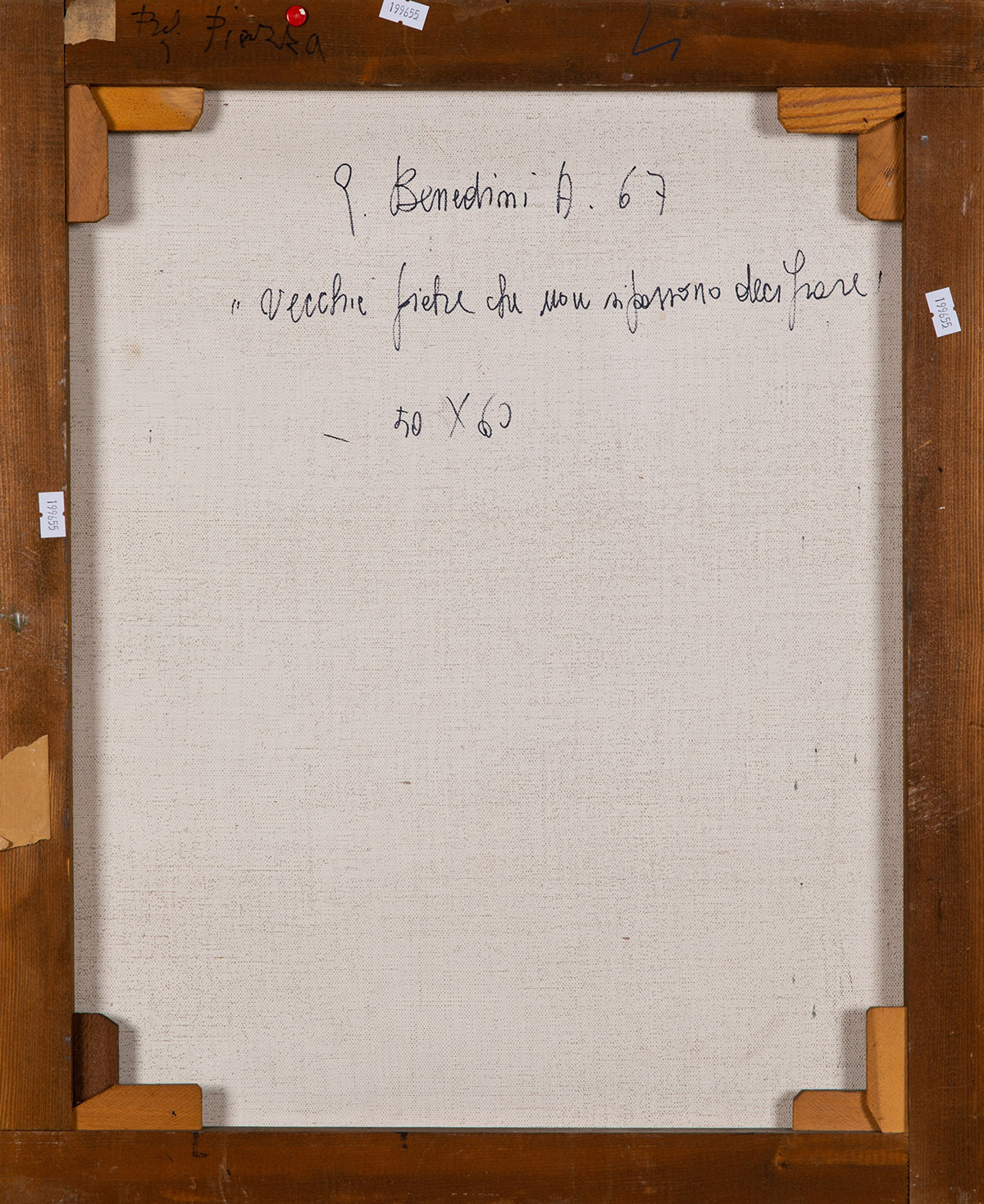Gabriella Benedini (1932), Vecchie pietre che non si possono decifrare, 1967, olio su tela, cm 60x50 firmato e datato in basso a sinistra firmato, intitolato e datato al retro