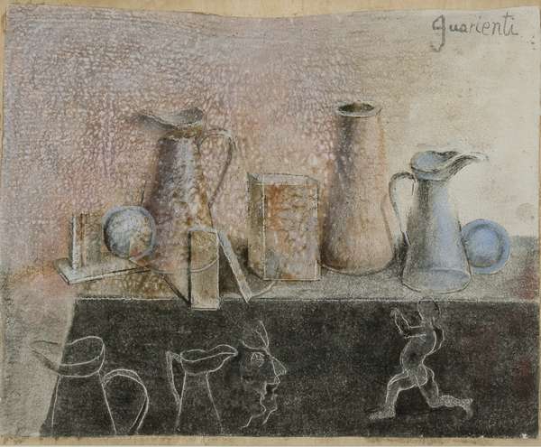 Carlo Guarienti Natura morta, 1998 tecnica mista su caseato di calcio, cm. 47x55-dipinto per cm 36x46 Firma in alto a dx Bibliografia: Roberto Sanesi, "GUARIENTI", Rex Built-In, pag.37
