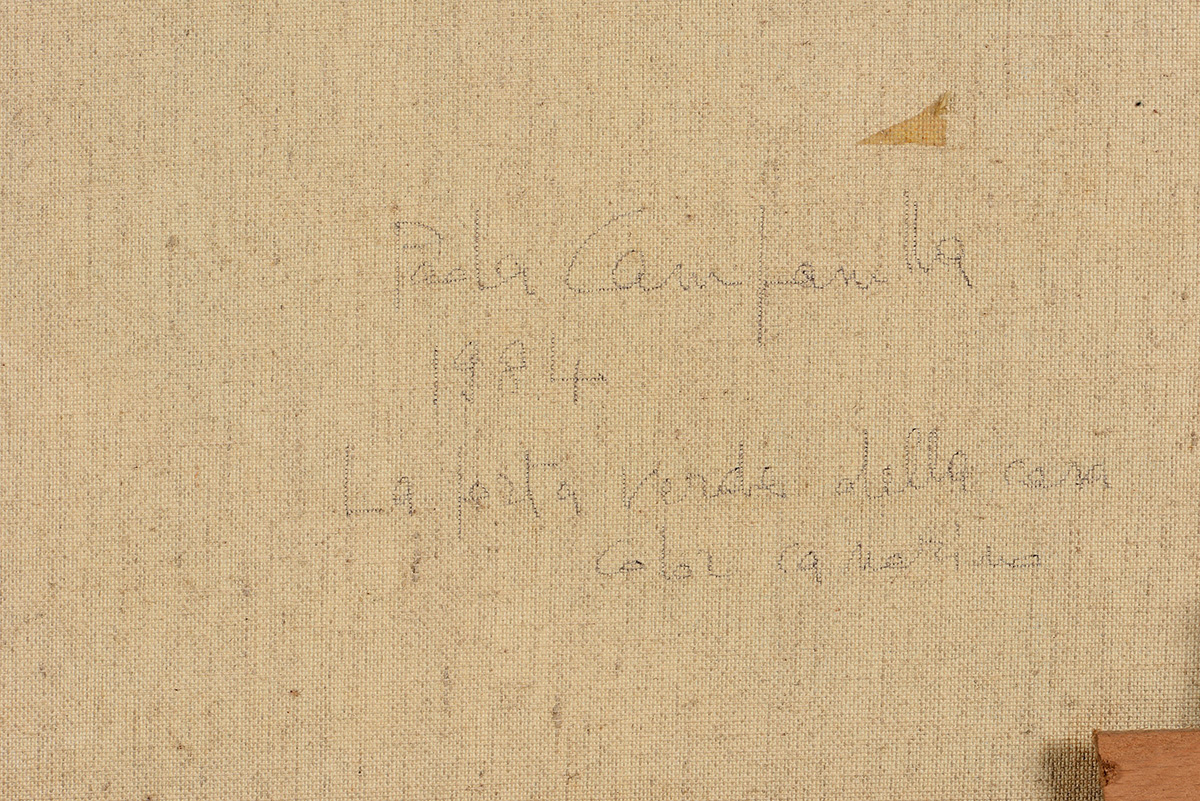Paola Campanella (1930), La porta verde della casa color canarino, 1984, acrilico su tela, cm 120x91 firmato, intitolato e datato al retro