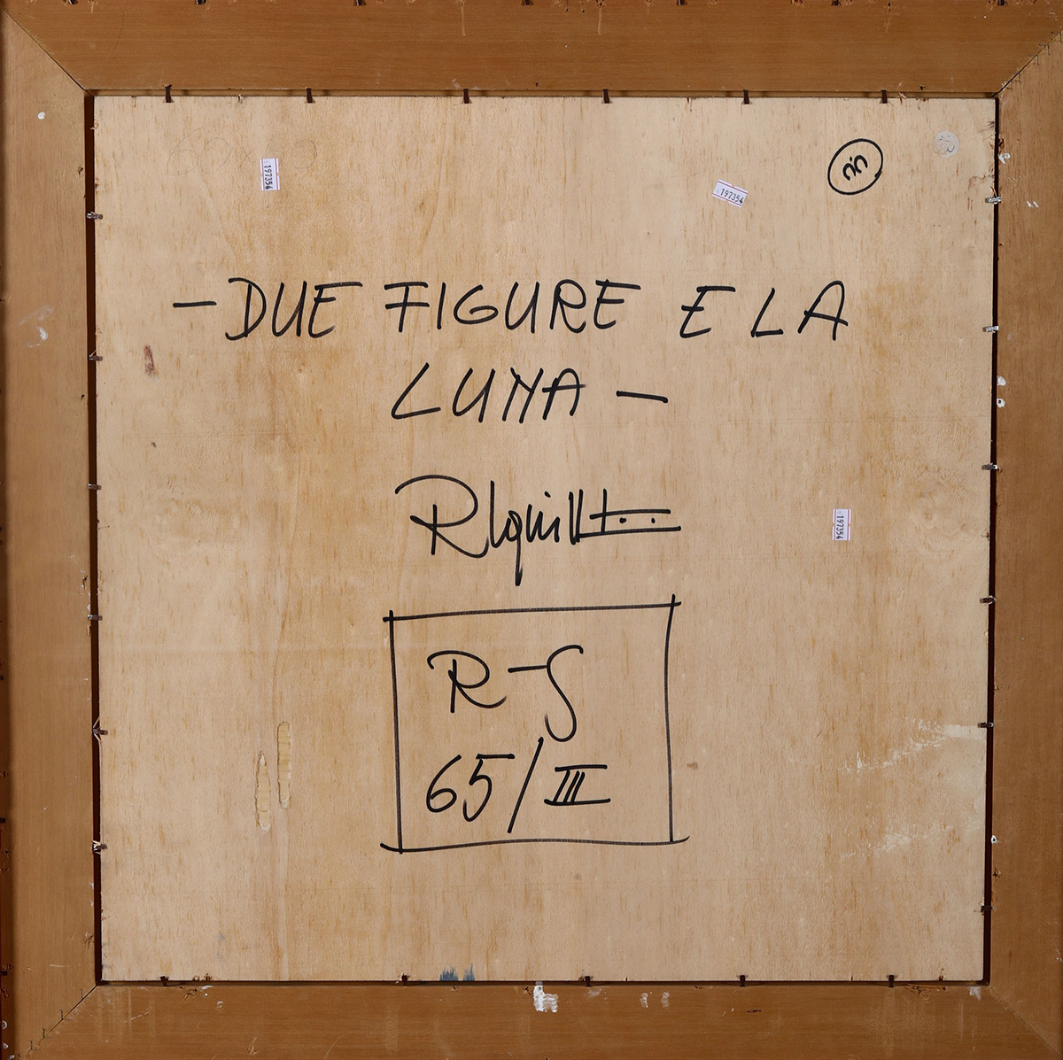 Remo Squillantini (1920-1996), Due figure e la luna, 1965, olio su tavola, cm 60x60 firmato in basso a sinistra firmato, intitolato e datato al retro