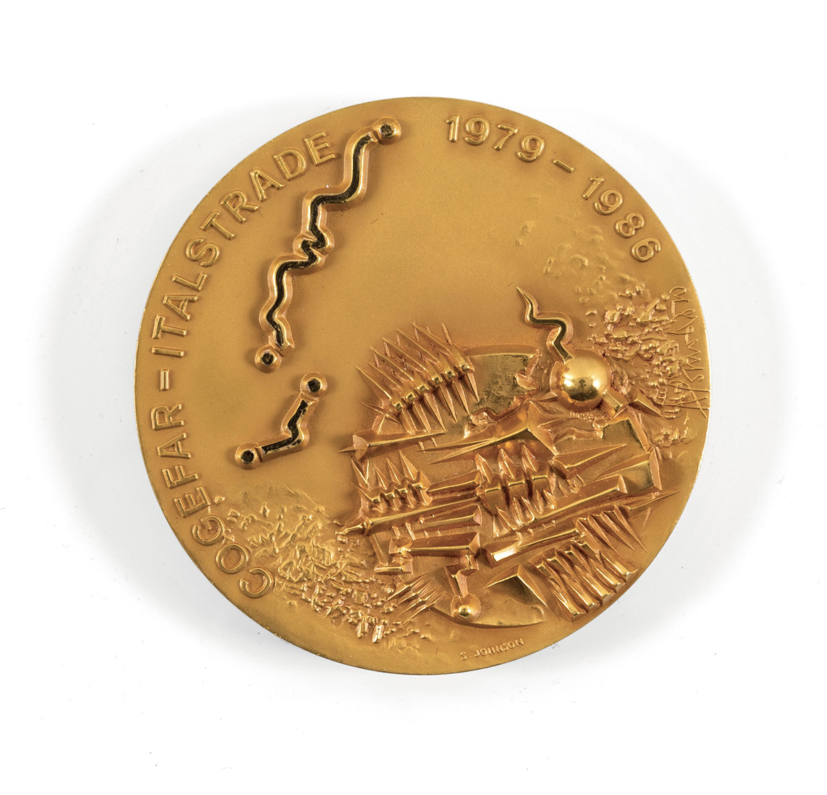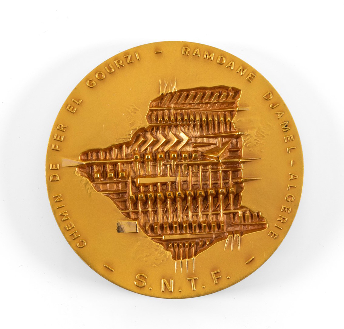 Arnaldo Pomodoro (1926), Medaglia per la ferrovia Algerina di El Gourzi - Cogefar Italstrade, 1986, metallo dorato, diametro cm 8 realizzata con il metodo a conio dallo Stabilimento Stefano Johnson di Milano. Opera registrata presso l’Archivio Arnaldo Pomodoro, Milano, con il n. M/86/3, Bibliografia: Johnson M., Artisti e medaglie: la recente produzione Johnson. Arnaldo Pomodoro, in “Medaglia”, Milano, n. 25, XVIII, 1990, ill. p. 154