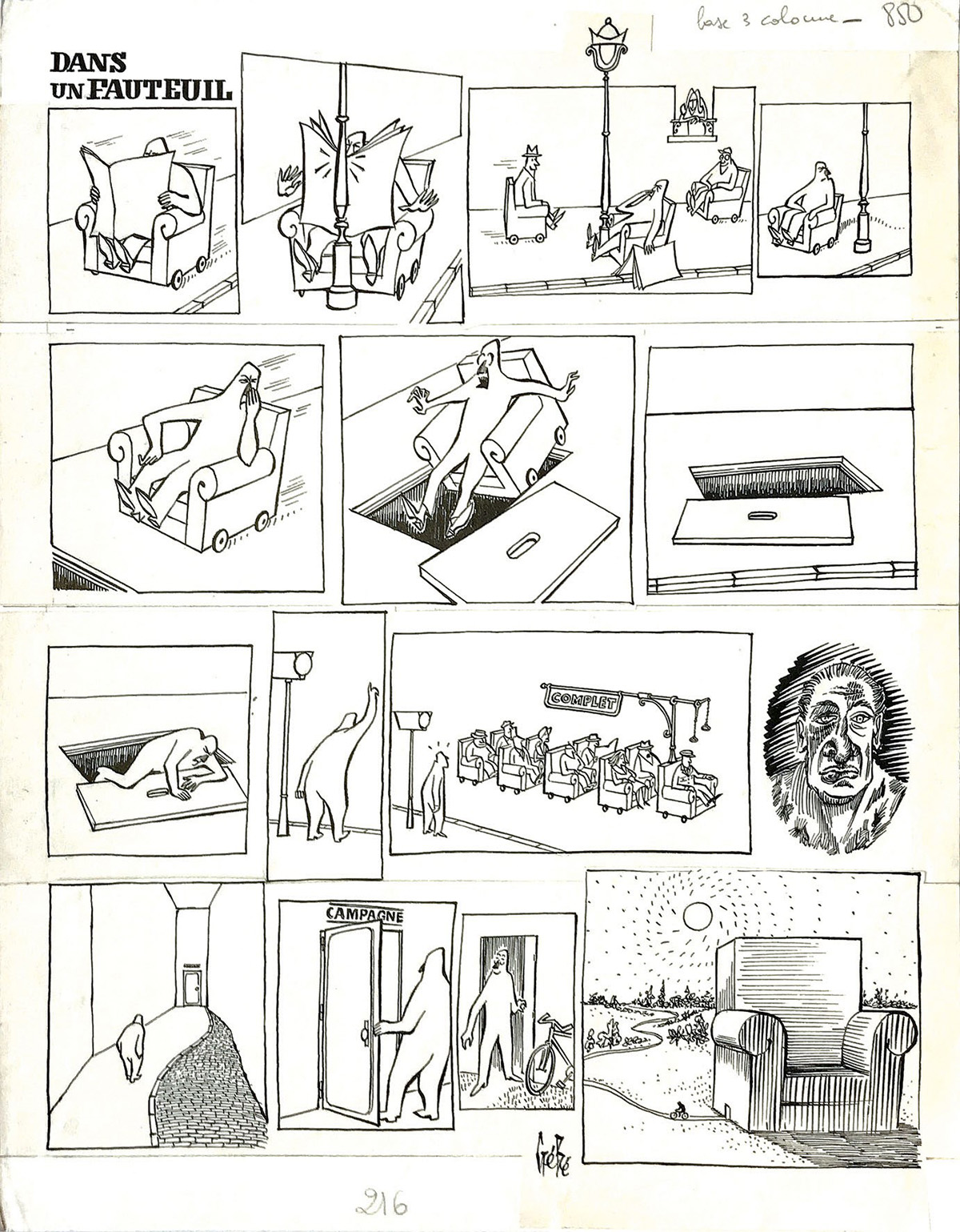 Gebè, Dans Un Fauteuil; Arrivée., Coppia di tavole umoristiche per la storica rivista Hara-Kiri, 1965-1966.Matita e china su cartoncino. Cm 38x30 circa. Ottimo stato. Firmate.