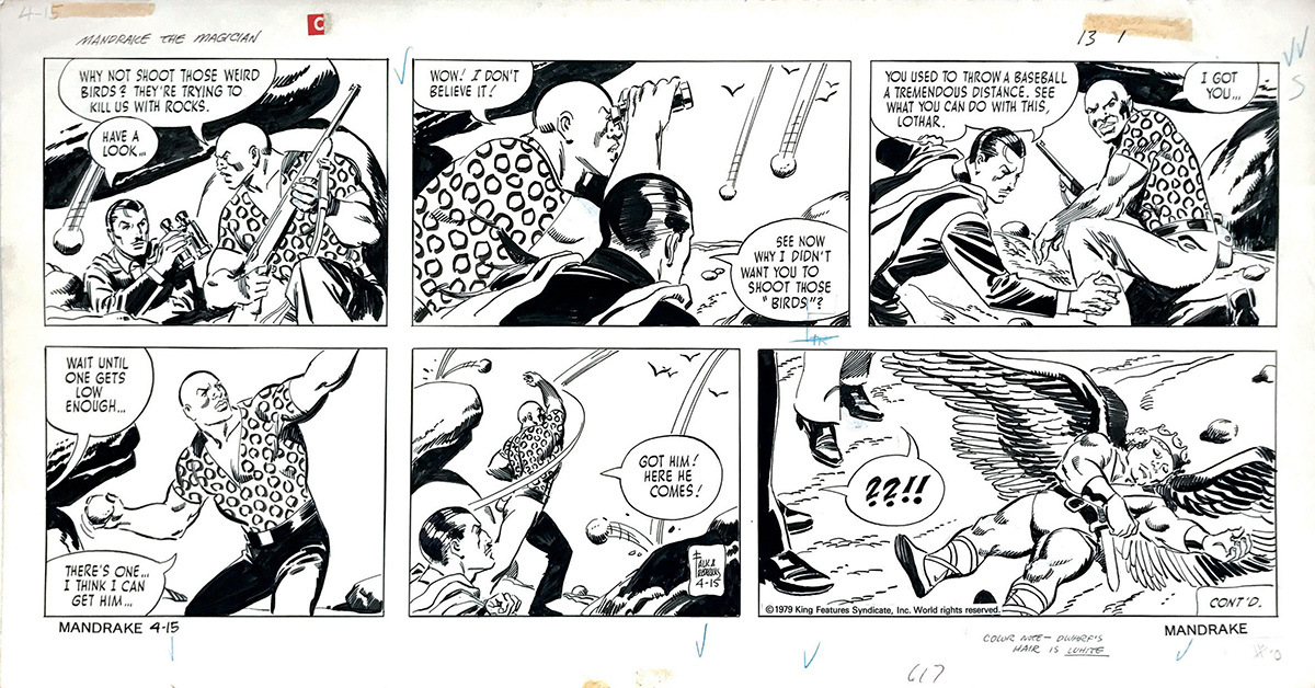Fred Fredericks (1929-2015), Mandrake The Magician, Tavola domenicale pubblicata il 15 Aprile 1979. Matita e china su cartoncino. Cm 29x57. Firmata alla penultima vignetta da Falk, creatore del personaggio, e da Fredericks disegnatore.