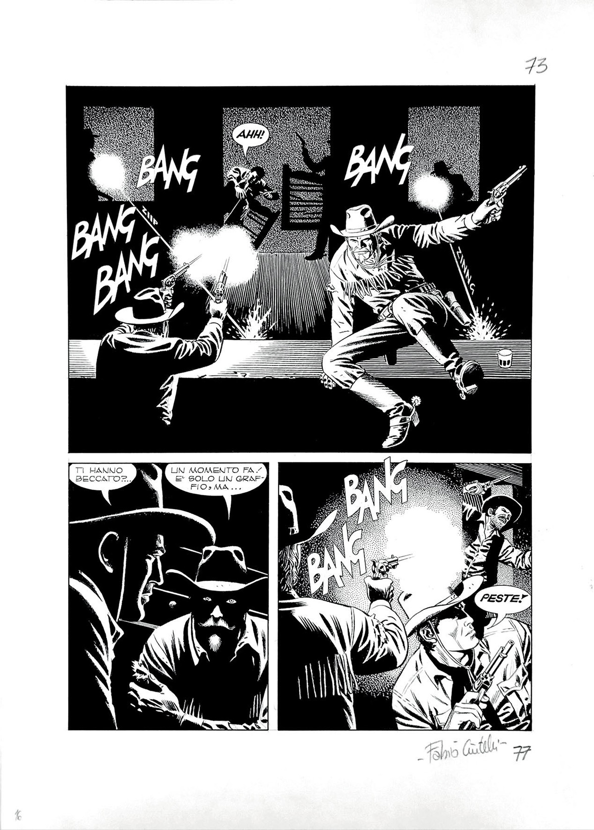 Fabio Civitelli (1955), Tex Il segno di Yama. Sparatoria al buio., 73° tavola pubblicata a pagina 77 di “Tex” n.673. Matita e china su cartoncino. Cm 30x42. Firmata. In cornice.