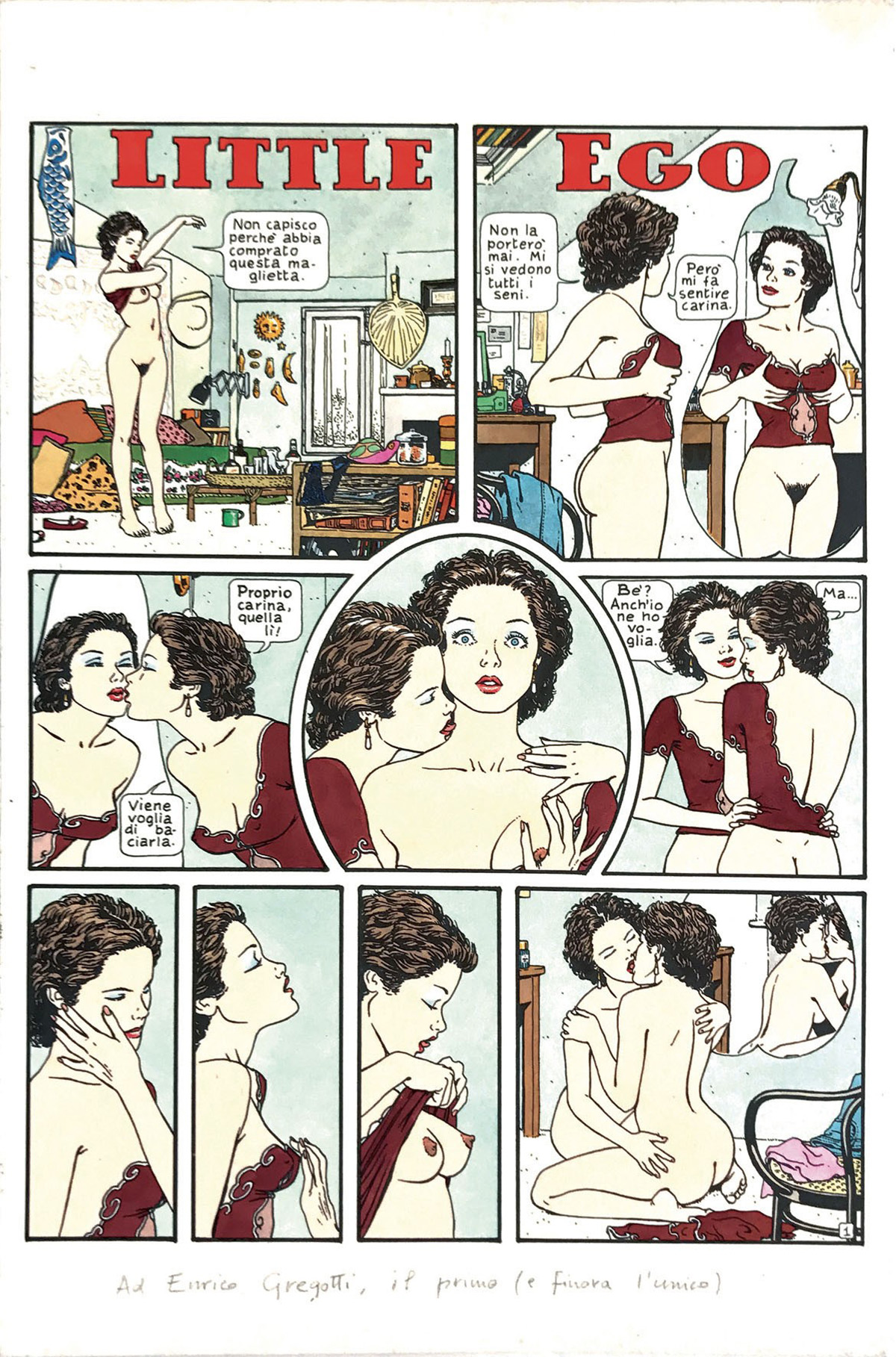 Vittorio Giardino (1946), Little Ego, Storia autoconclusiva composta da 2 tavole. China e acquerello su cartoncino, ciascuna cm 22,5x34 ( illustrazione cm 21,5x28,2 ). Firmata e datata 1983 all’ultimo pannello. Al margine bianco una dedica a matita firmata e datata 1995. Ottimo stato., La prima storia di Little Ego. Come tutti i grandi artisti anche Giardino ha voluto confrontarsi con il genere erotico. L’ha fatto da par suo, scegliendo un personaggio ispirato al più geniale creatore di immagini del ‘900, Winsor Mc Cay. Le atmosfere oniriche mediate dall’artista statunitense, unite all’indubbia capacità dell’artista bolognese di disegnare donnine in stile “linea chiara”, hanno creato un personaggio magico e sensuale. Le opere originali di Giardino, rarissime, sono collezionate in Europa e oltreoceano.