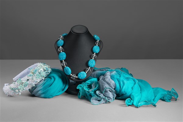 Lotto composto da un cerchietto con ricamo fatto a mano dal Maestro Pino Grasso, una sciarpa in chiffon nei toni del turchese e grigio e una collana con paste vitree turchesi e trasparenti