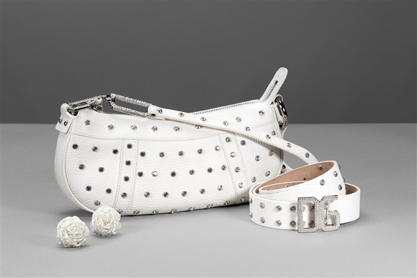Lotto composto da una borsetta a tracolla in pelle martellata bianca interamente tempestata di strass con logo in strass, cintura en pendant e un paio di orecchini a boule di canottiglie bianche