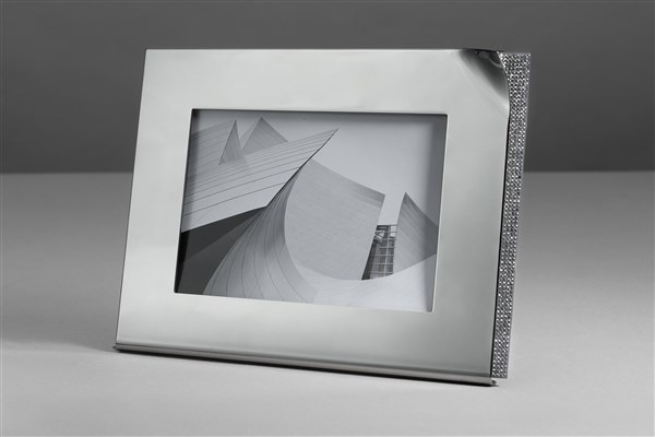 Cornice in metallo color argento decorata con swarovski trasparenti su un lato, scatola originale (cm 13x8.5 riquadro)